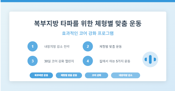 이 글에서는 체형별로 최적화된 복부 운동 프로그램과 함께, 내장지방과 피하지방에 각각 효과적인 운동법의 차이를 알려드리려고 합니다. 또한 초보자부터 고급자까지 누구나 따라할 수 있는 30일 코어 강화 챌린지 프로그램도 소개해 드릴게요. 자, 이제 당신의 체형에 딱 맞는 복부 운동을 찾아볼까요?