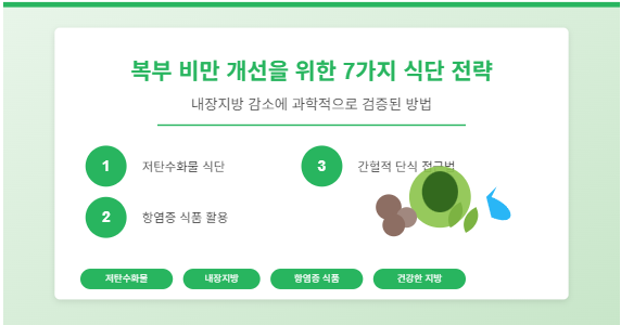 여러분은 어떤 방법으로 복부 비만을 관리하고 계신가요? 오늘은 과학적 연구에 기반한 7가지 식단 전략을 소개해 드릴게요. 이 방법들은 내장 지방을 효과적으로 감소시키는 데 도움이 됩니다.