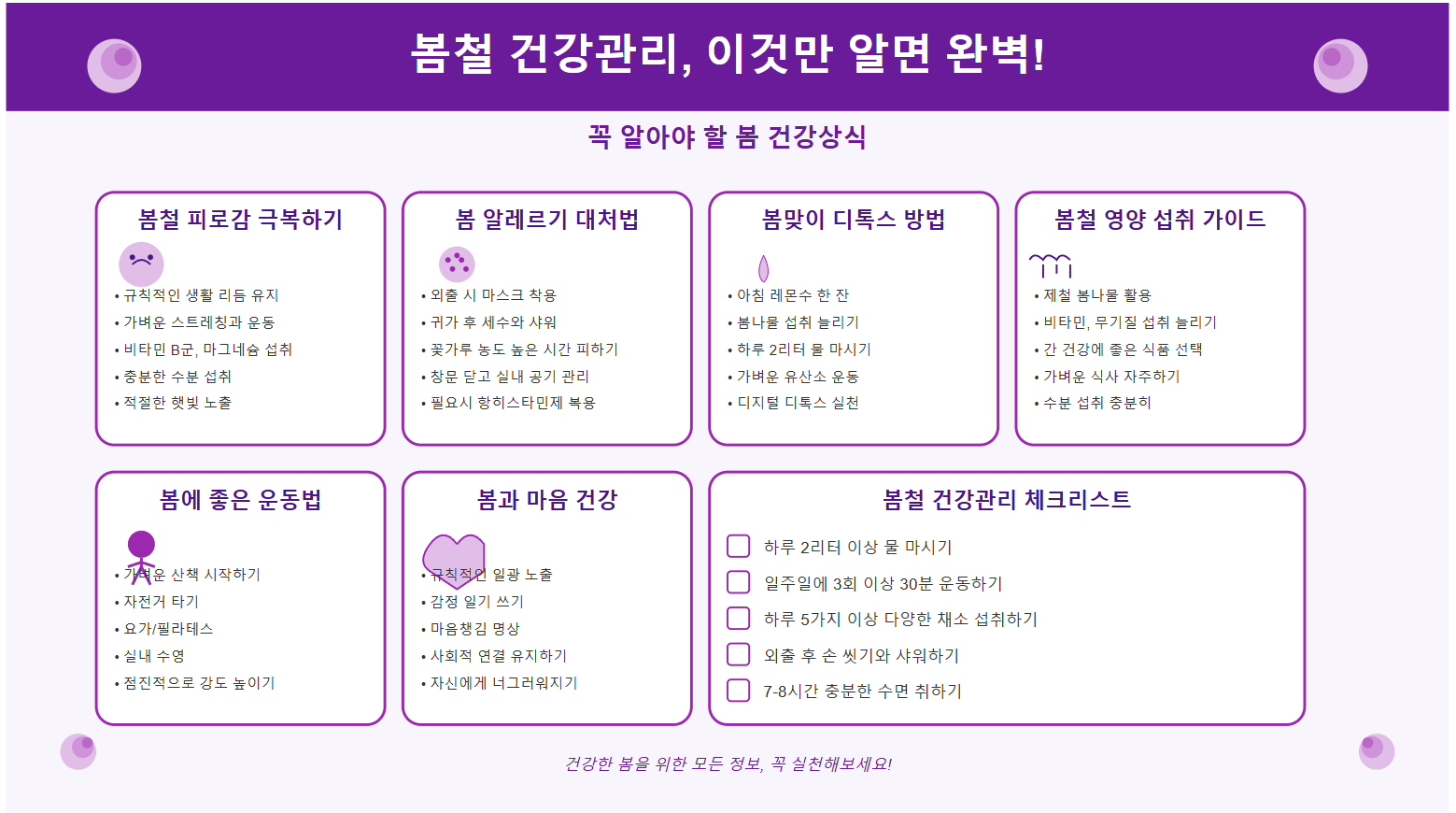 봄 건강관리, 봄철 피로감, 봄 알레르기, 미세먼지 대처법, 봄맞이 디톡스, 봄철 영양섭취, 봄철 운동법, 계절성 우울증, 건강한 생활습관, 봄철 면역력
