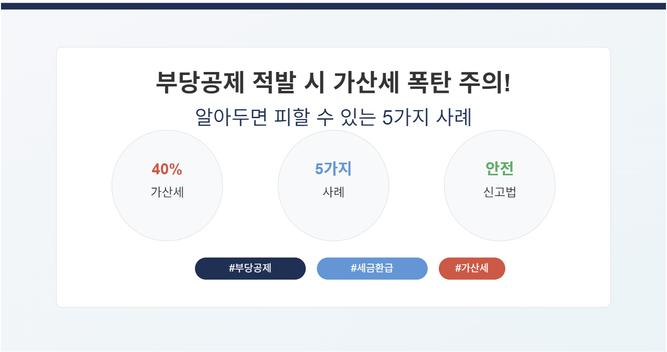 이처럼 부당공제가 적발되면 단순히 누락된 세금만 추가로 납부하는 것이 아니라, 40%에 달하는 높은 가산세까지 부담해야 합니다. 특히 고의성이 인정되는 경우에는 향후 세무조사 대상자로 선정될 가능성도 높아지므로 더욱 주의해야 합니다.