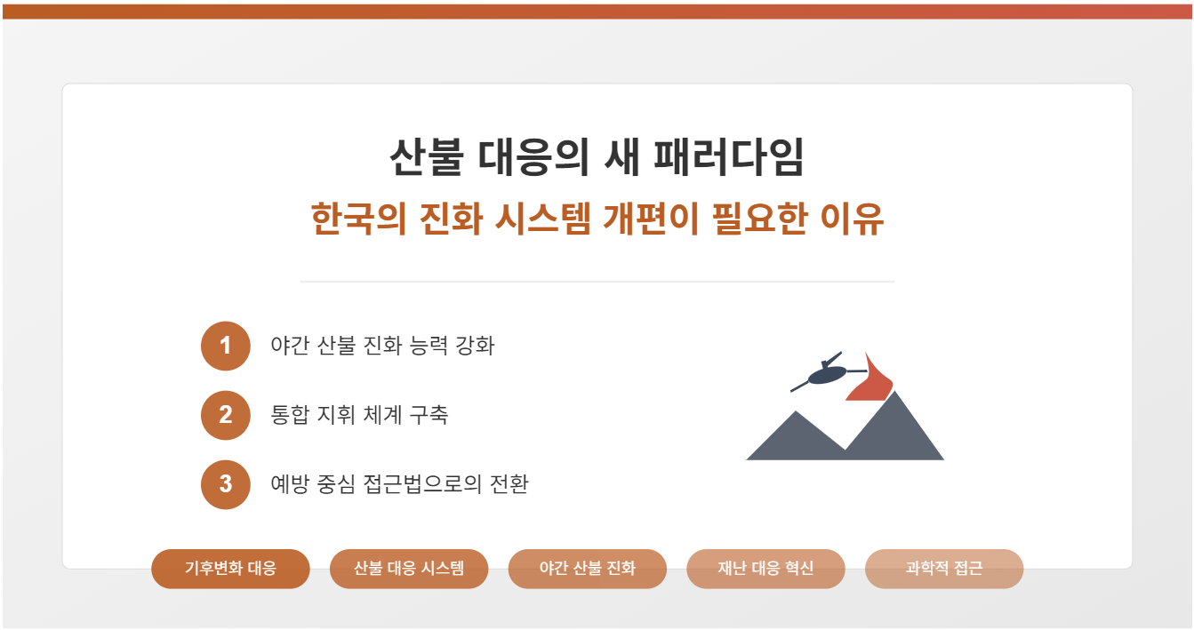 현재 한국의 산불 대응은 주로 산불 발생 후 진화에 초점이 맞춰져 있습니다. 그러나 기후변화 시대에는 예방 중심의 접근법이 더욱 중요해지고 있습니다.