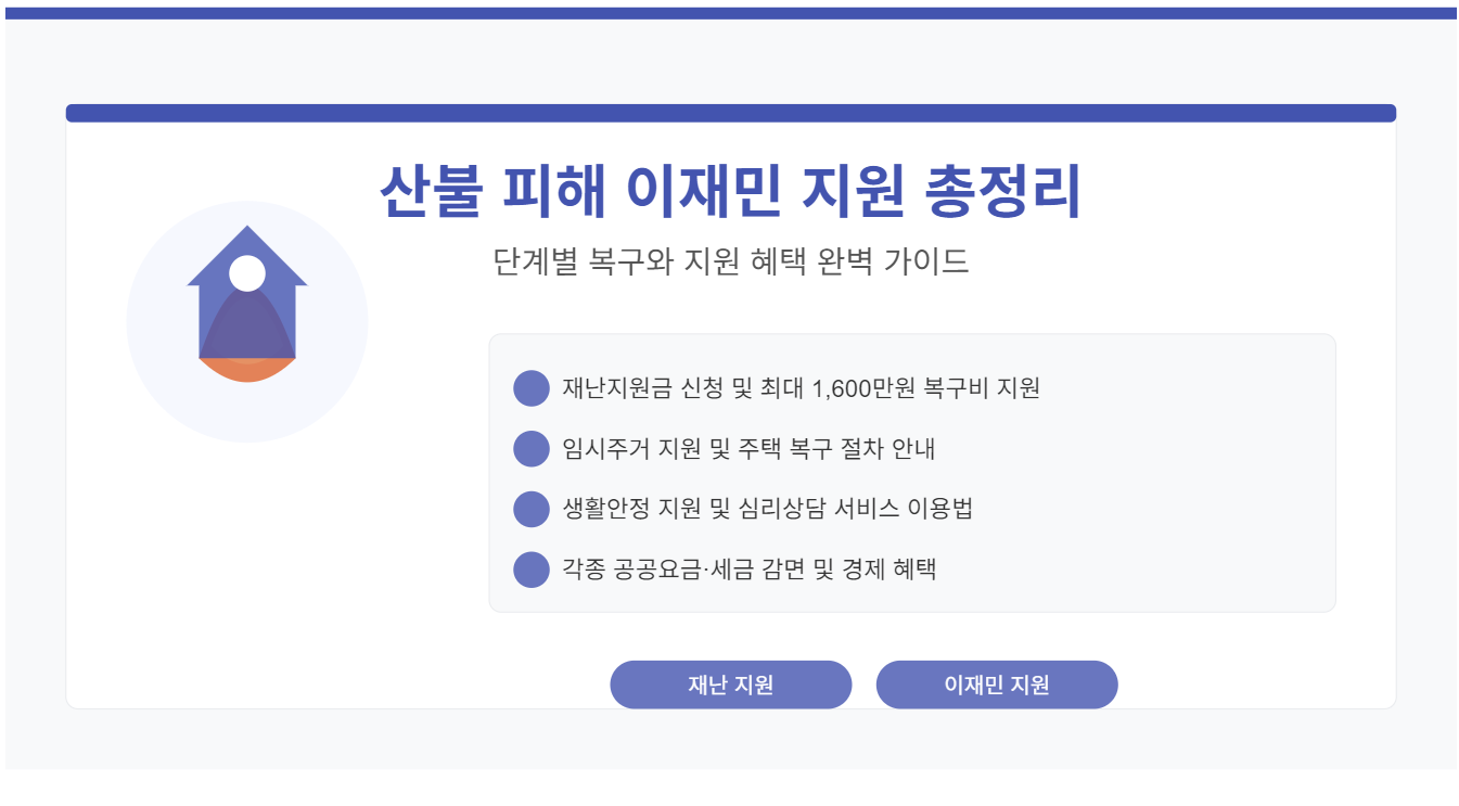 - 긴급 의료비 지원: 산불 관련 부상이나 질병 치료 비용 지원 (최대 300만원)