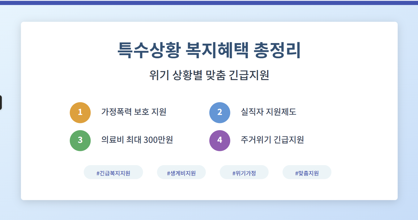갑작스러운 위기 상황은 누구에게나 찾아올 수 있습니다. 가정폭력, 실직, 중병 발병... 이런 상황에 처하면 마음의 여유를 갖기도 어렵고, 어떤 지원을 받을 수 있는지 알아볼 시간조차 부족하죠.